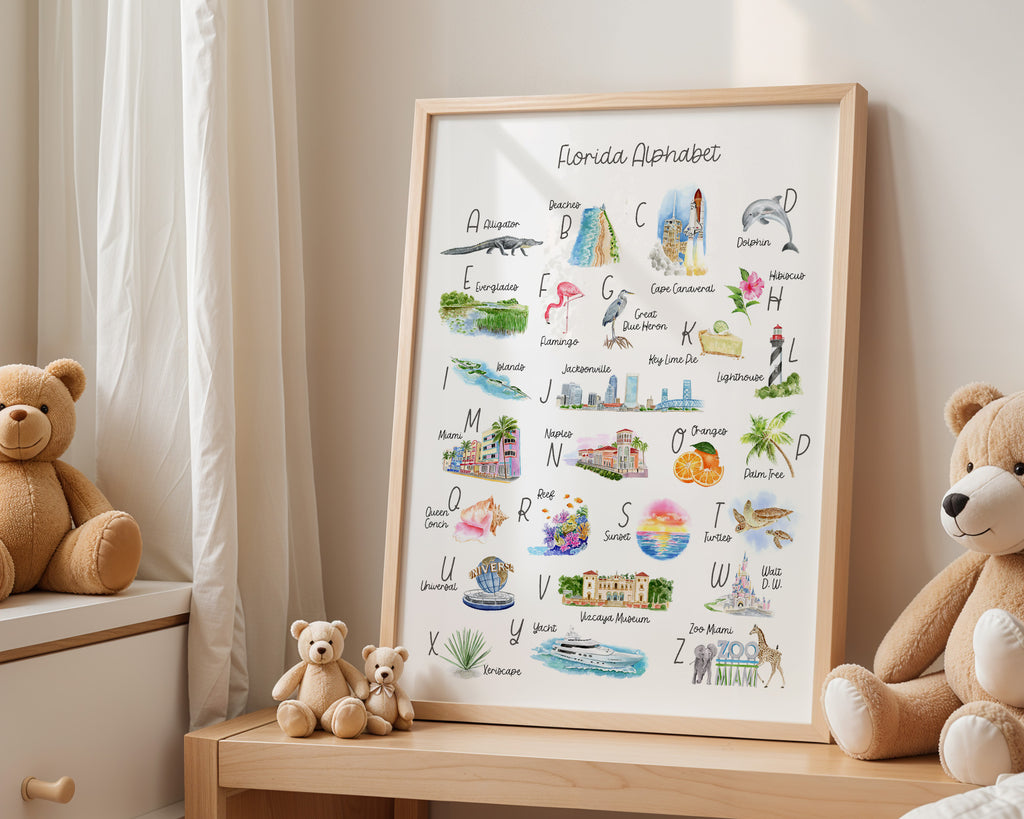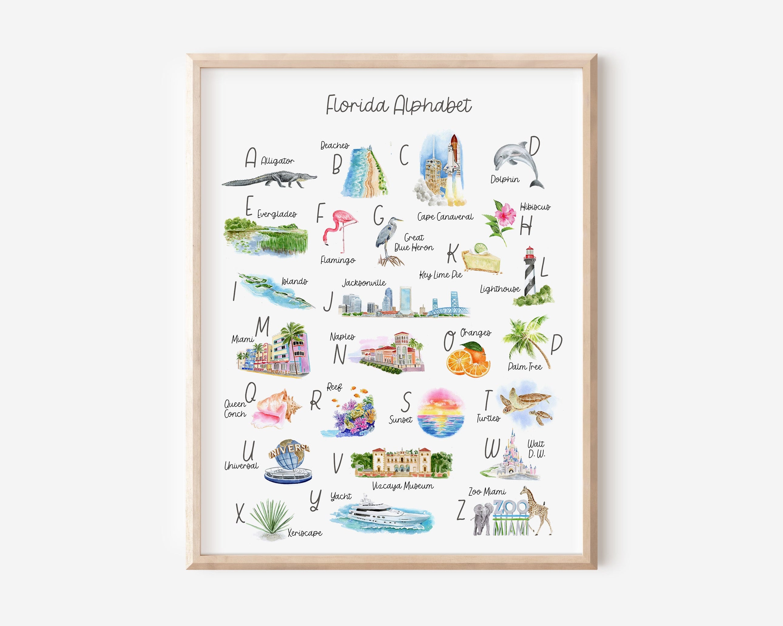 This charming and one-of-a-kind Florida Alphabet Print features 26 original watercolor illustrations inspired by the Sunshine State’s beaches, wildlife, and wonder. From alligators to Cape Canaveral rockets, dolphins to glowing sunsets, seashells to palm tree-lined streets, each letter celebrates something special about Florida’s sunny vibe.