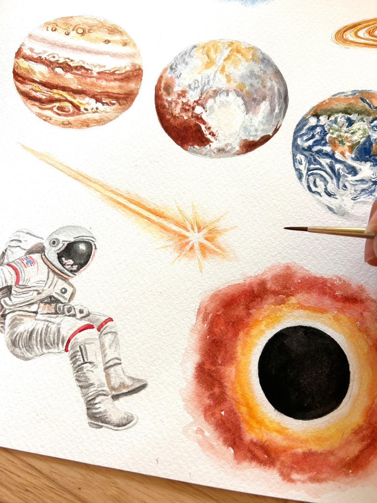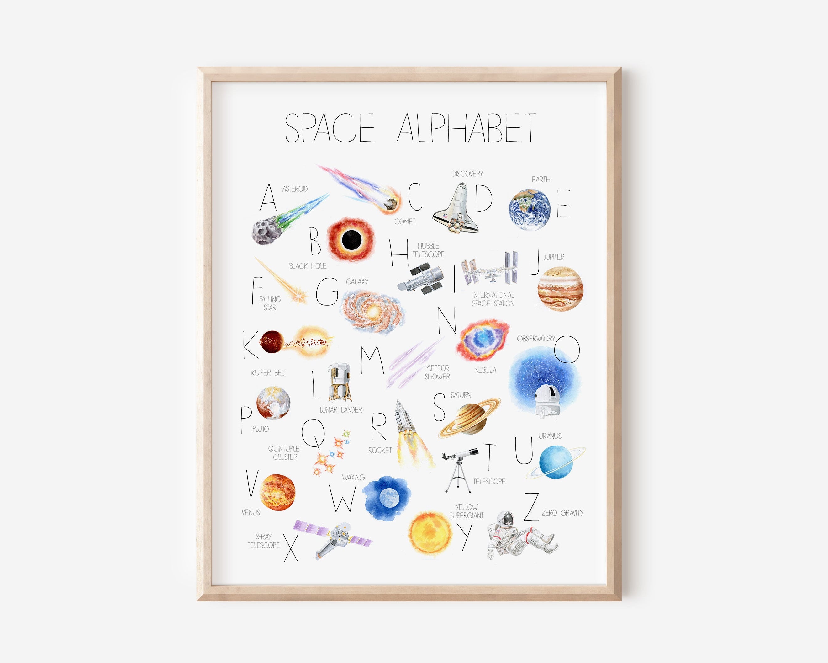This whimsical and one-of-a-kind Outer Space Alphabet Print features 26 original watercolor illustrations inspired by the magic of the cosmos. From astronauts to black holes, comets to galaxies, each letter celebrates something extraordinary about the universe beyond our skies.
