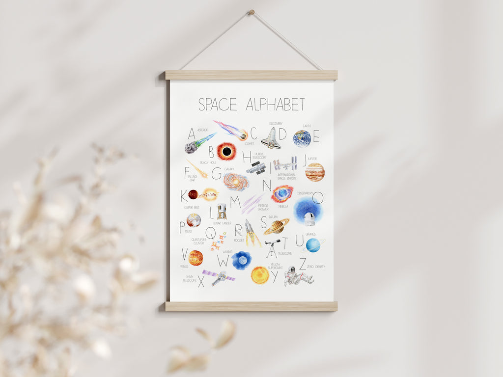Painted by hand in a fun and inviting color palette, this piece invites moments of curiosity and wonder as you explore the ABCs with your little one (or your inner space nerd!)—daydreaming of rocket launches, glowing constellations, and galaxies far, far away.